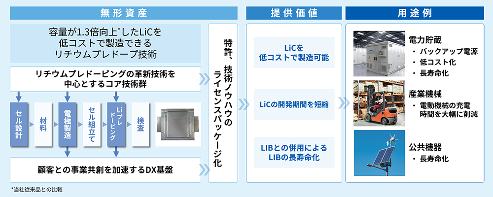 独自開発したリチウムプレドープ技術を核とした特許および技術ノウハウのライセンスパッケージを提供。