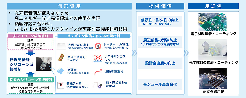 独自の合成技術によって高接着性・光学的透明性・耐光性・高耐熱性など、さまざまな機能を有する革新的なシリコーン系接着剤を実現