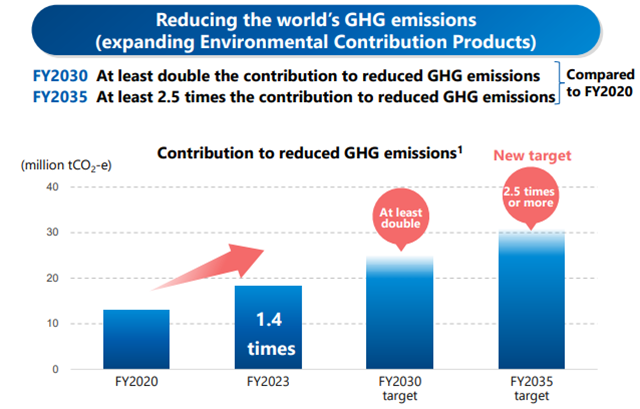 Volume of the GHG reduction contribution from Environmental Contribution Products | 2.5 times or more compared to fiscal 2020 | At least double compared to fiscal 2020 | 1.40 times (Reference value) Approximately 18 million tons* |