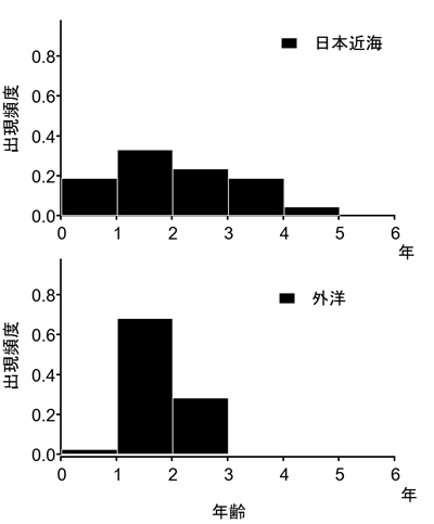 日本近海で採取したマイクロプラスチック片(n=32)と、北西太平洋や赤道で採取したもの (n=24)の年齢頻度分布を示す。日本近海の年齢は0~5歳と幅があるが、北西太平洋や赤道といった外洋に浮遊するマイクロプラスチックの年齢は、ほとんどが1~3歳の範囲に限られた。