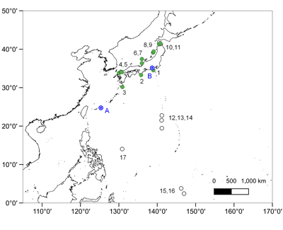 図1の日本近海は図2の1~11に相当し、外洋(北西太平洋と赤道)は、12~17である。AとBは、屋外暴露試験を行った宮古島と富士市の位置を示している。