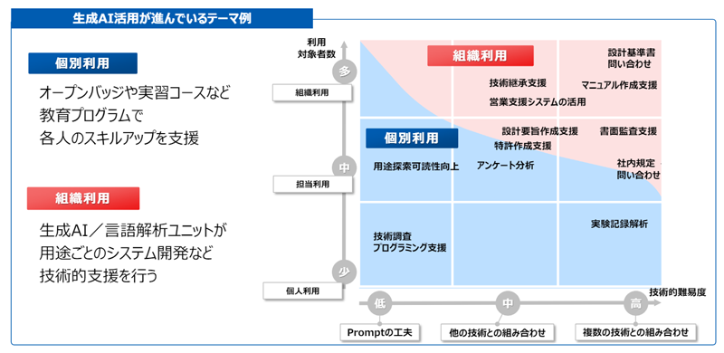 当社では2023年5月に従業員向け生成AI利用ガイドラインを発行し、いち早く生成AIを業務利用できるようにしました。さらに専任組織「生成AI/言語解析ユニット」を中心にシステム実装や人材育成を行うなど、積極的な活用を促進しています。ある部門では、書面監査対応プロセスを生成AIにより効率化し、回答精度を高めるとともに、年間で約1820時間の時間短縮を実現できる見込みです。この他にも、エンジニアリング部門での技能伝承、住宅事業での顧客提案など、さまざまな事業・部門で導入を進めています。
