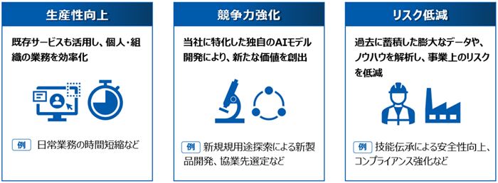 当社は2023年5月よりグループ全体での積極的な生成AI活用を支援し、業務効率化を進めてきました。今後は生産性向上に加え、上記のような競争力強化や事業上のリスク低減に生成AIを活用していきます。